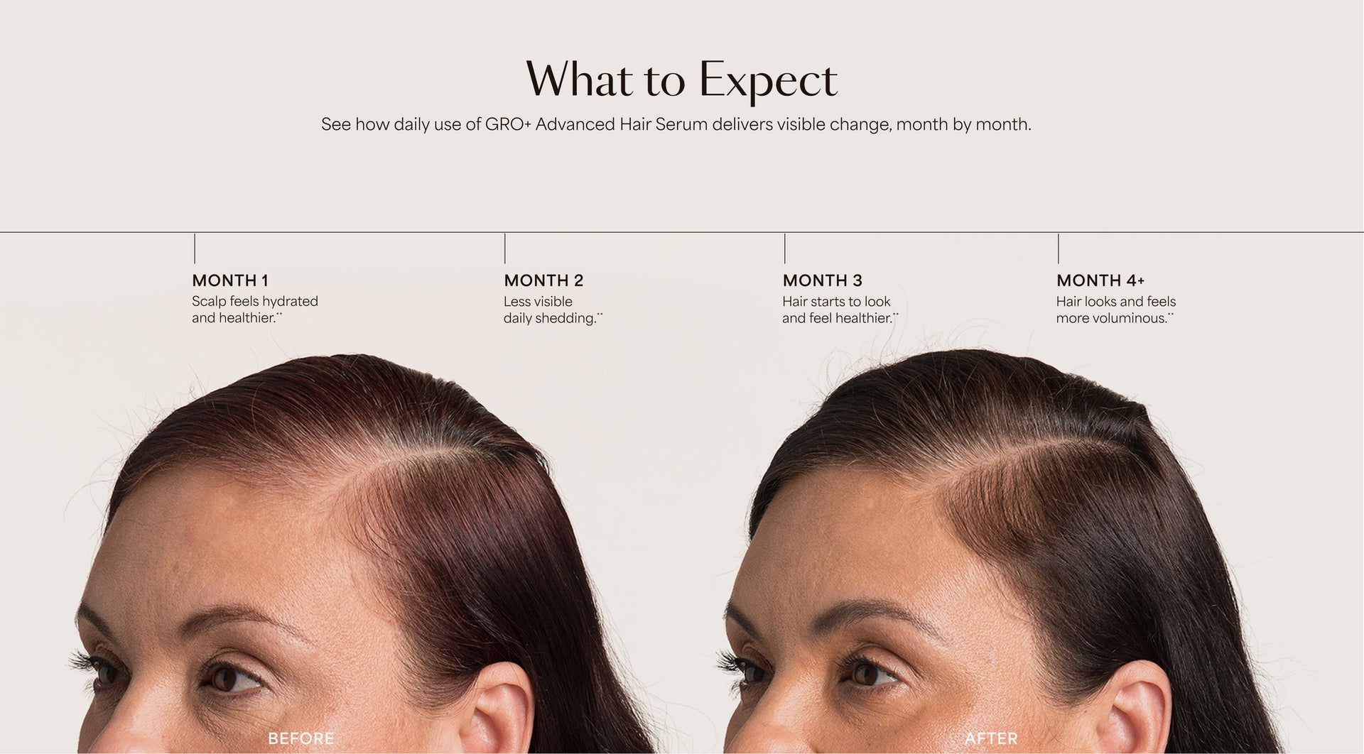 *Based on a 120-day independent, third-party clinical study with 40 participants using GRO+ Advanced Hair Serum once daily.