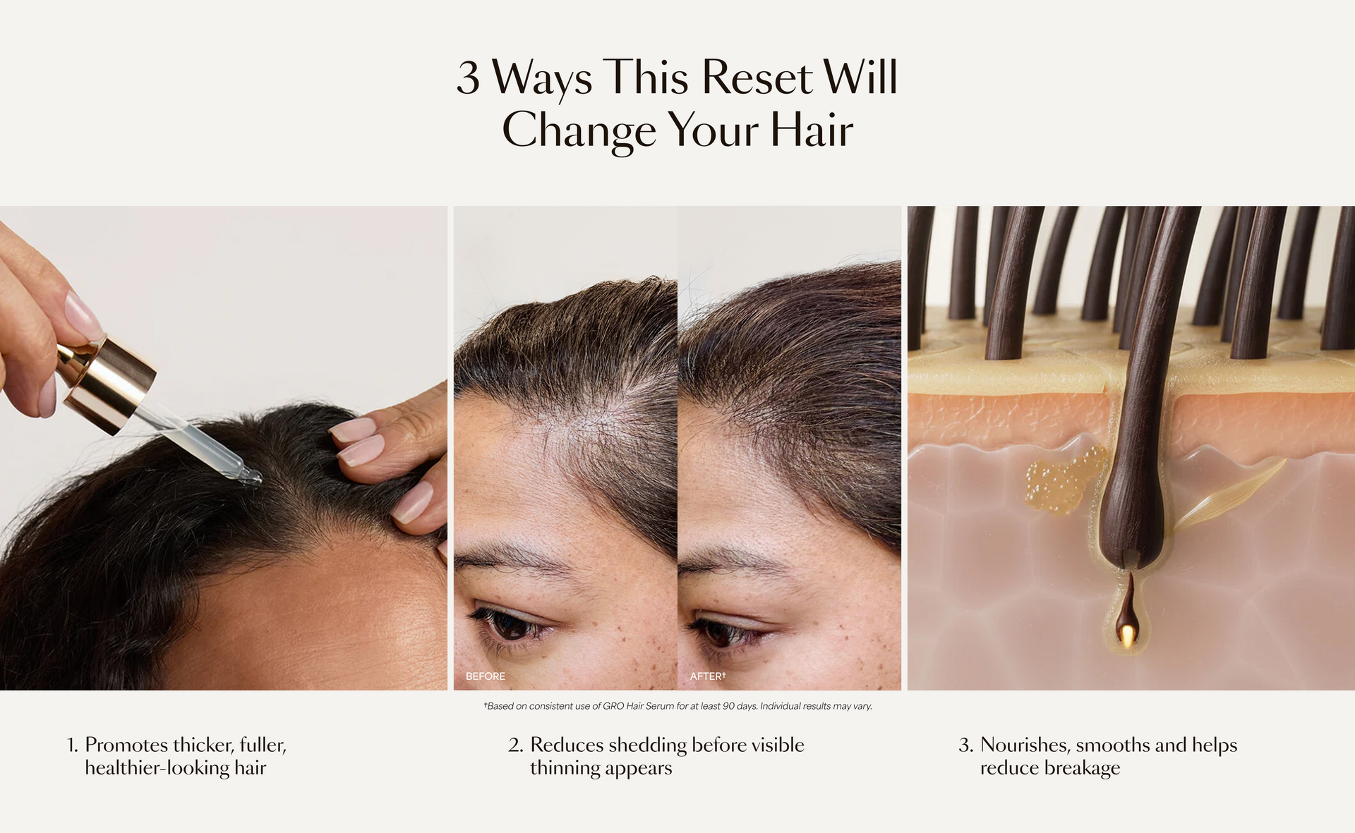 The 90-Day Hair Wellness® Reset is a holistic program to help your hair recover, rebuild and thrive after the holidays. Choose the GRO Reset System that fits your lifestyle and goals, then use the products alongside our free coaching series to support fuller, healthier-looking hair in as little as 90 days.